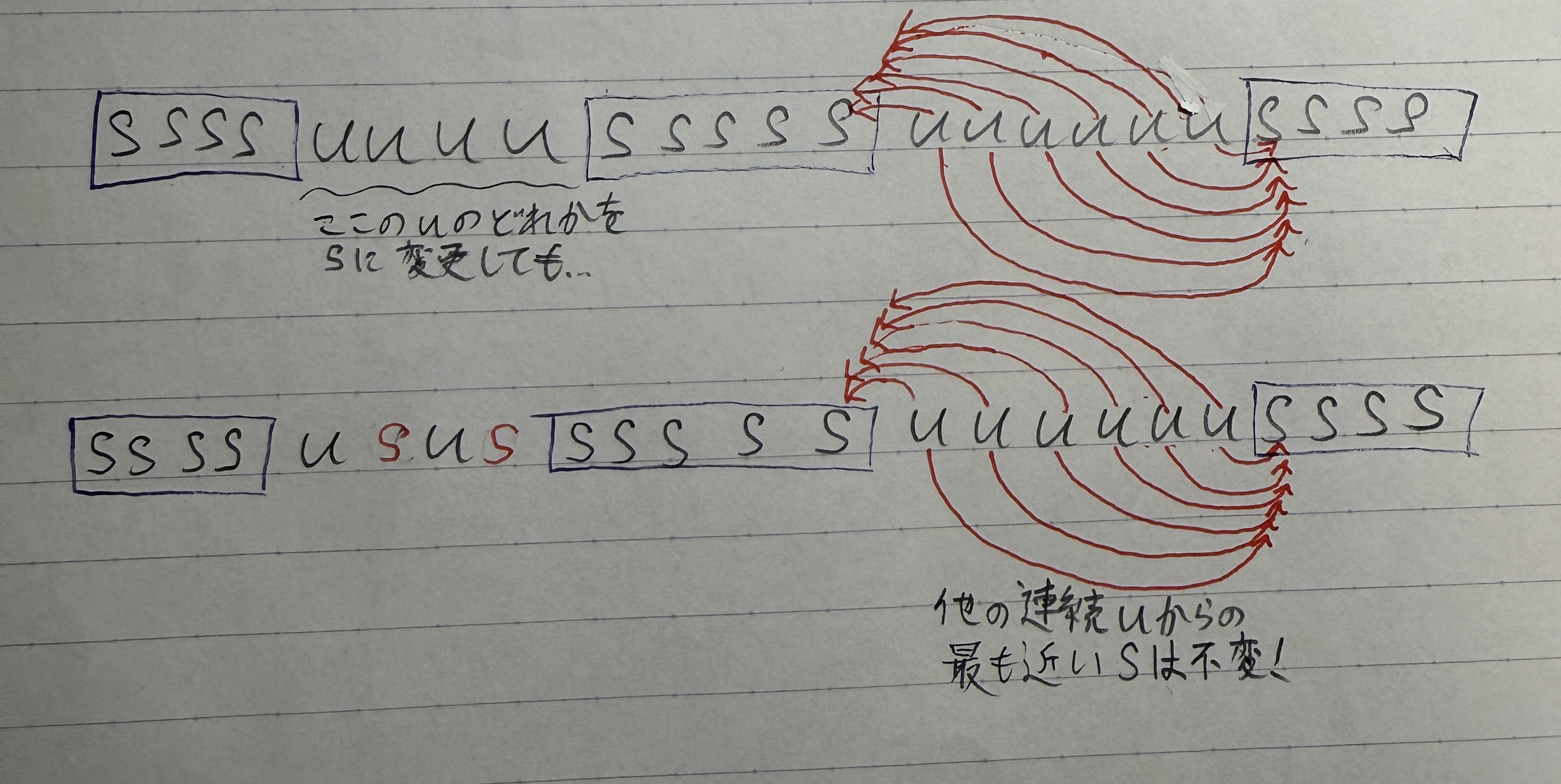 (ここで、異なる連続u部分は要素変更に干渉し合わないことがわかる。なぜならば、下の画像のように、連続uのどこかをsに変更したとしても、他の連続uから見た「直近のsの距離」は変わらないからだ。)