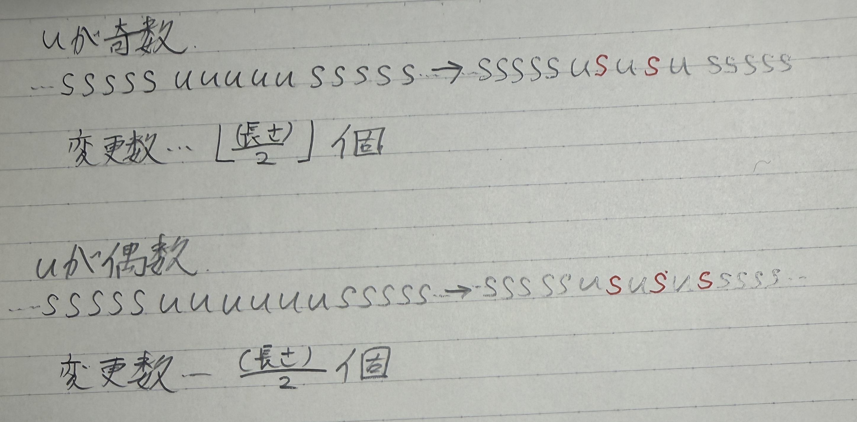 解説では貪欲法でやってみるが、その正当性の証明が少し難しいので、uの長さの偶奇に注目する。それぞれの連続u部分について、sへ変更する最低回数は以下のようになる。