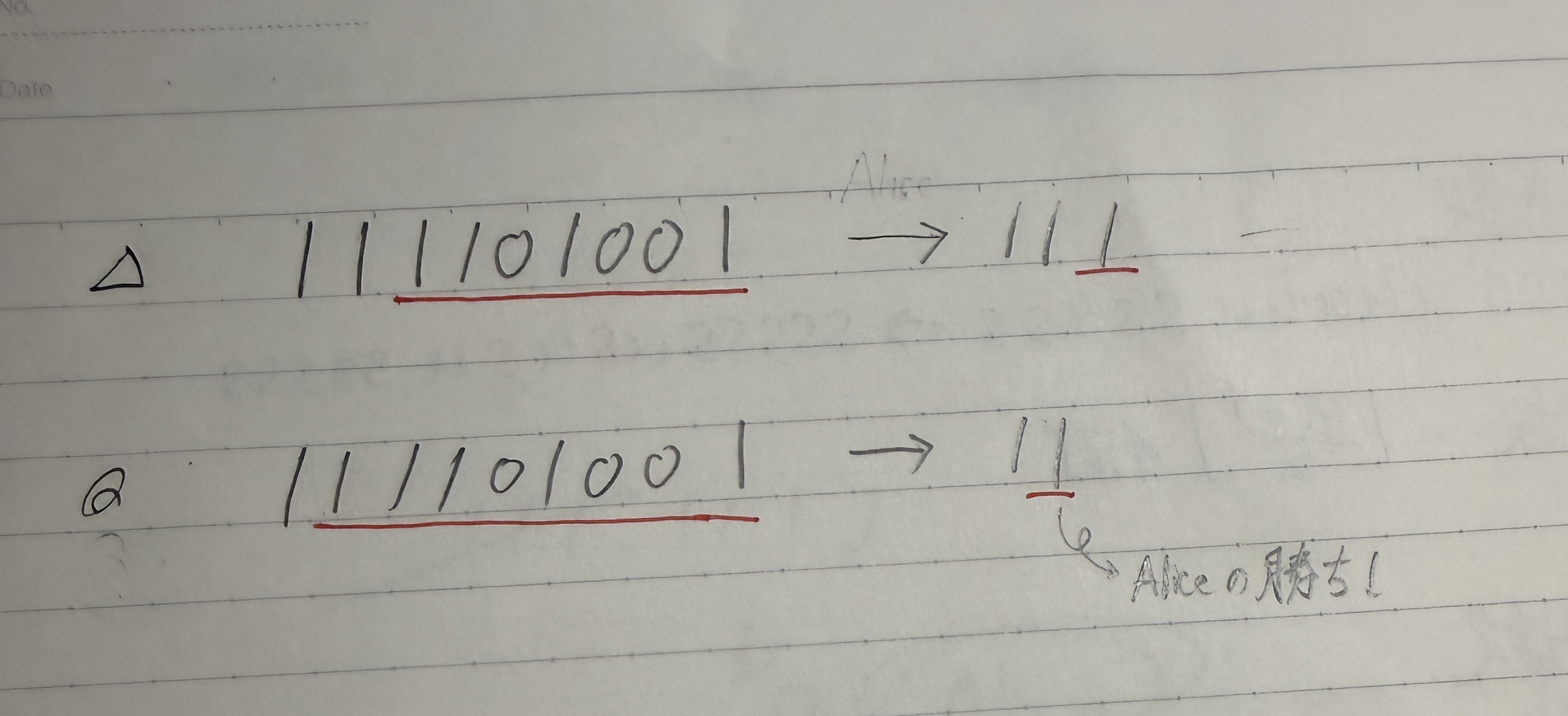 そして、1だけの長さ2の数列、すなわち{1,1}であればBobは{1, 1}-->{0}とするしかなく、Aliceの勝ちである。